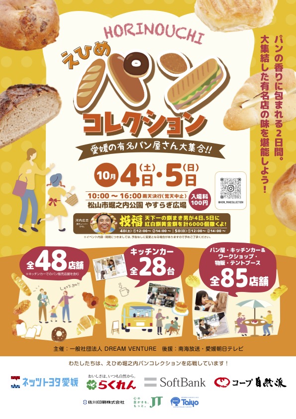 全国の人気パン屋さんが愛媛・松山に集結!香ばしい香りが広がる「えひめ堀之内パンコレクション」が、やすらぎ広場で開催されます。各地の話題のベーカリーやキッチンカーが勢ぞろいし、できたてのパンやスイーツを楽しめる2日間。食べ歩きやお土産探しにもぴったりのイベントです。焼きたてのパンの香りに包まれながら、家族や友人と秋の味覚を堪能してみてください。